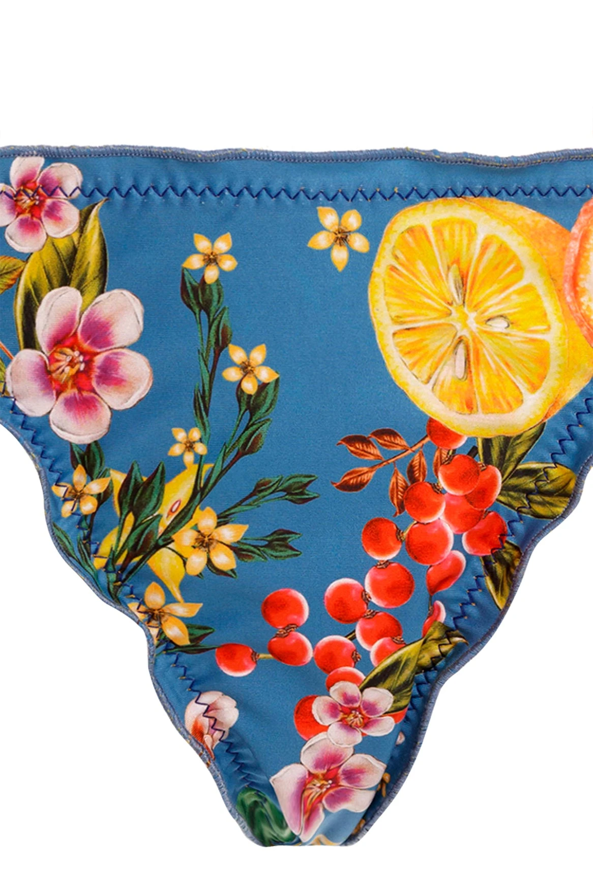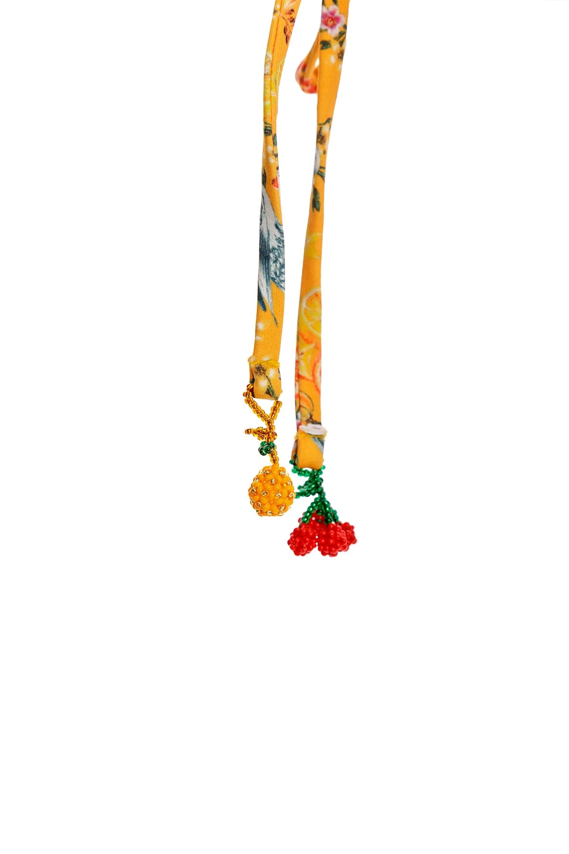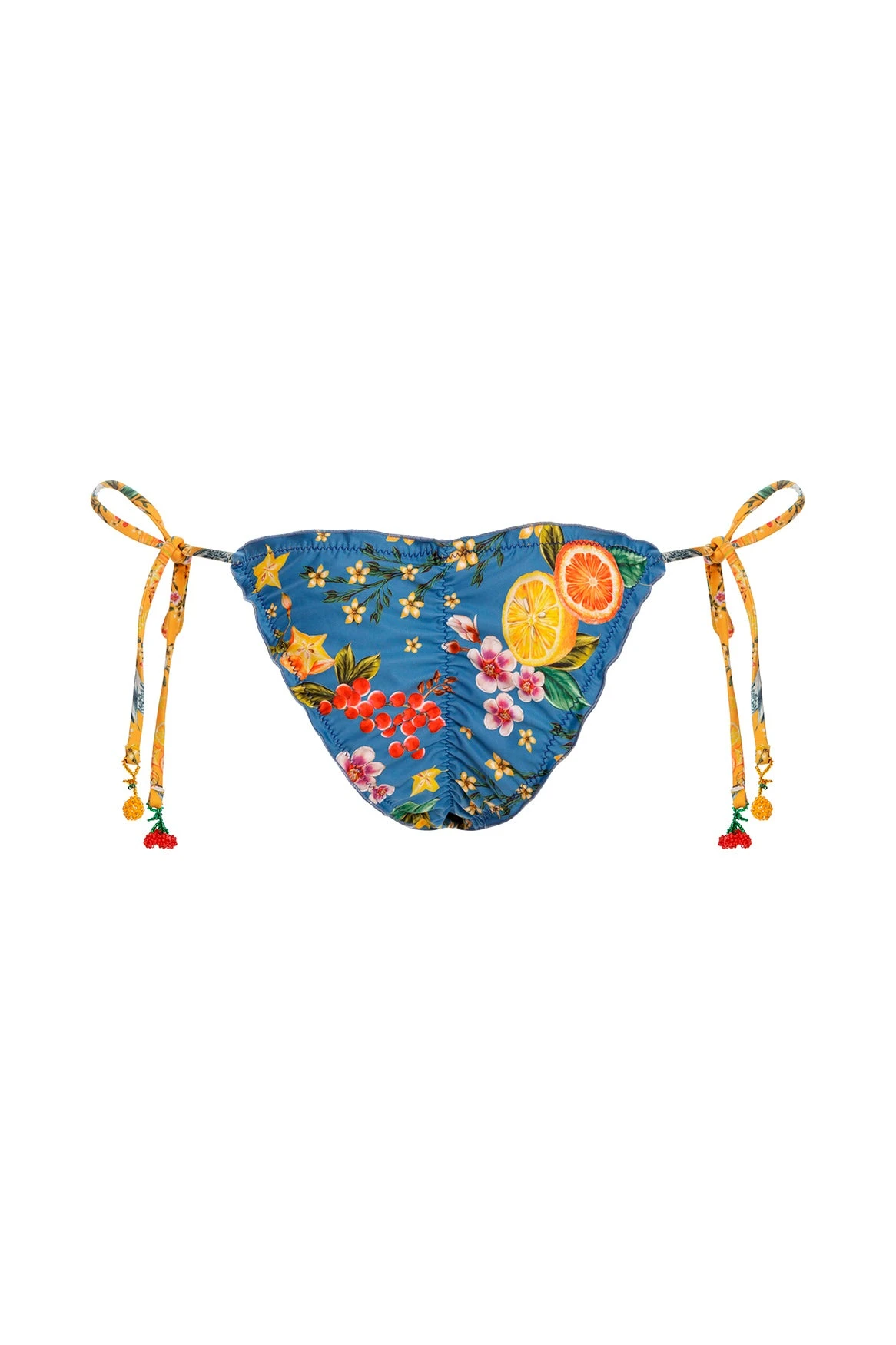 The Alegria Triangle Bikini Bottom is an adjustable side tie bottom trimmed with ruffled edging. The side ties are finished with handmade fruit tie ends. This piece was embroidered for 4 hours by Natalia Soto’s team of artisans, creating an exclusive article full of art.