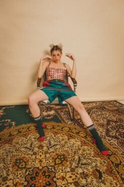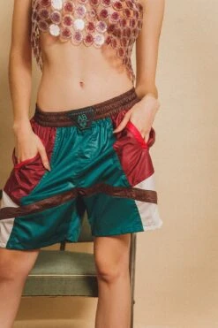 Lightweight color-blocked shorts with a vintage boxy style, featuring side pockets and an exclusive brand logo on the front of the waistband. A genderless short created to combine perfectly with our Helen Hoodie or our Christy Sweater.
