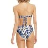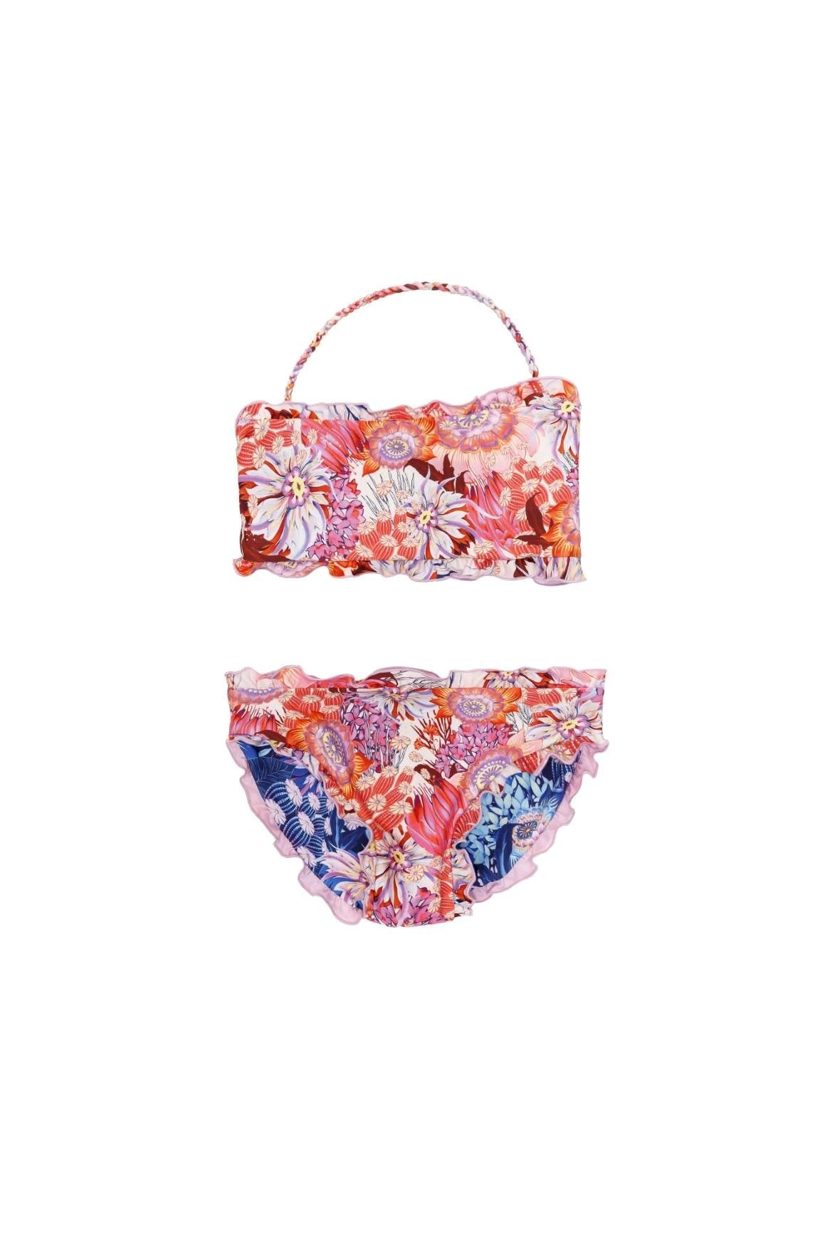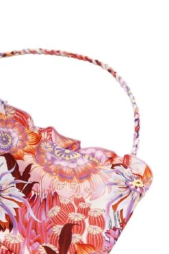 This bikini features a one-shoulder top and bottom with ruffled edging for a unique look. The top is embellished with hand-embroidered cherries and has a twisted strap to complete the handcrafted look.