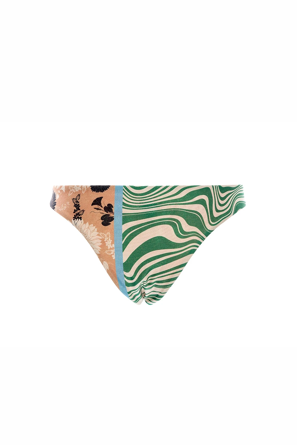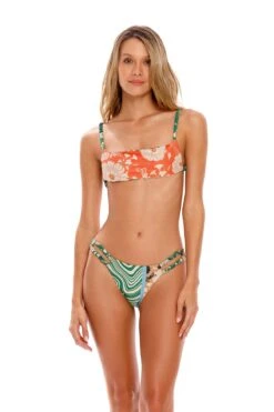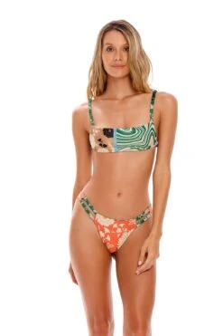 The Brianna bikini bottom is made with eco fabric. It’s a new silhouette and has the perfect fit and coverage. This piece is completely reversible to a second print. Agua Bendita creates sketches of figures, patterns, contrasts, and flowers with a localized print. Mixtures of colors and techniques. A groovy vibe with an unexpected romantic touch. Off white, toffee, black, sky, jade, tangie. Neutral bases with maximalist colors create disruptive elements.