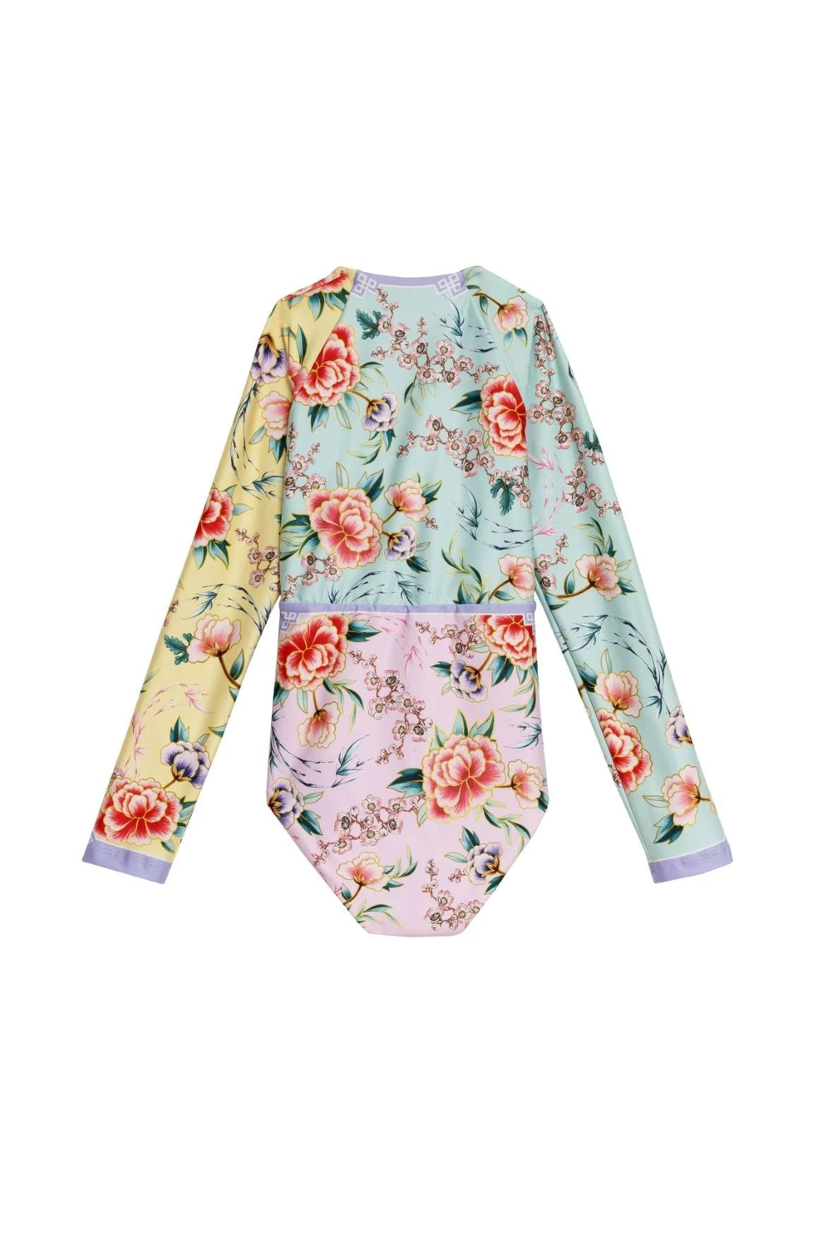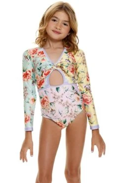 Our eye-catching cutout one-piece, the Cindy Kids One Piece, showcases a special artist-designed array of flowers detailed against backgrounds of different colors. A smooth-fitting back completes the look, making it a unique and fashionable choice for kids.