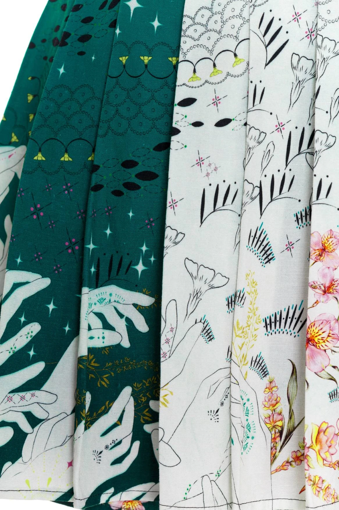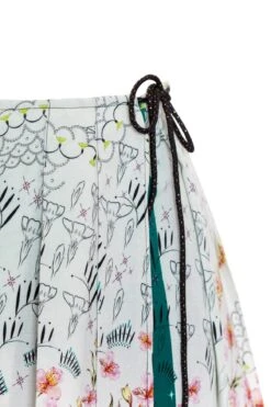 The Claire Skirt is a short pleated gem highlighted with cosmic, colorful beauty and the mesmerizing power of the hands. Finished with a side tie, it perfectly balances a flattering fit and a captivating look. Take a spin in this enchanting skirt and stand out with every step.