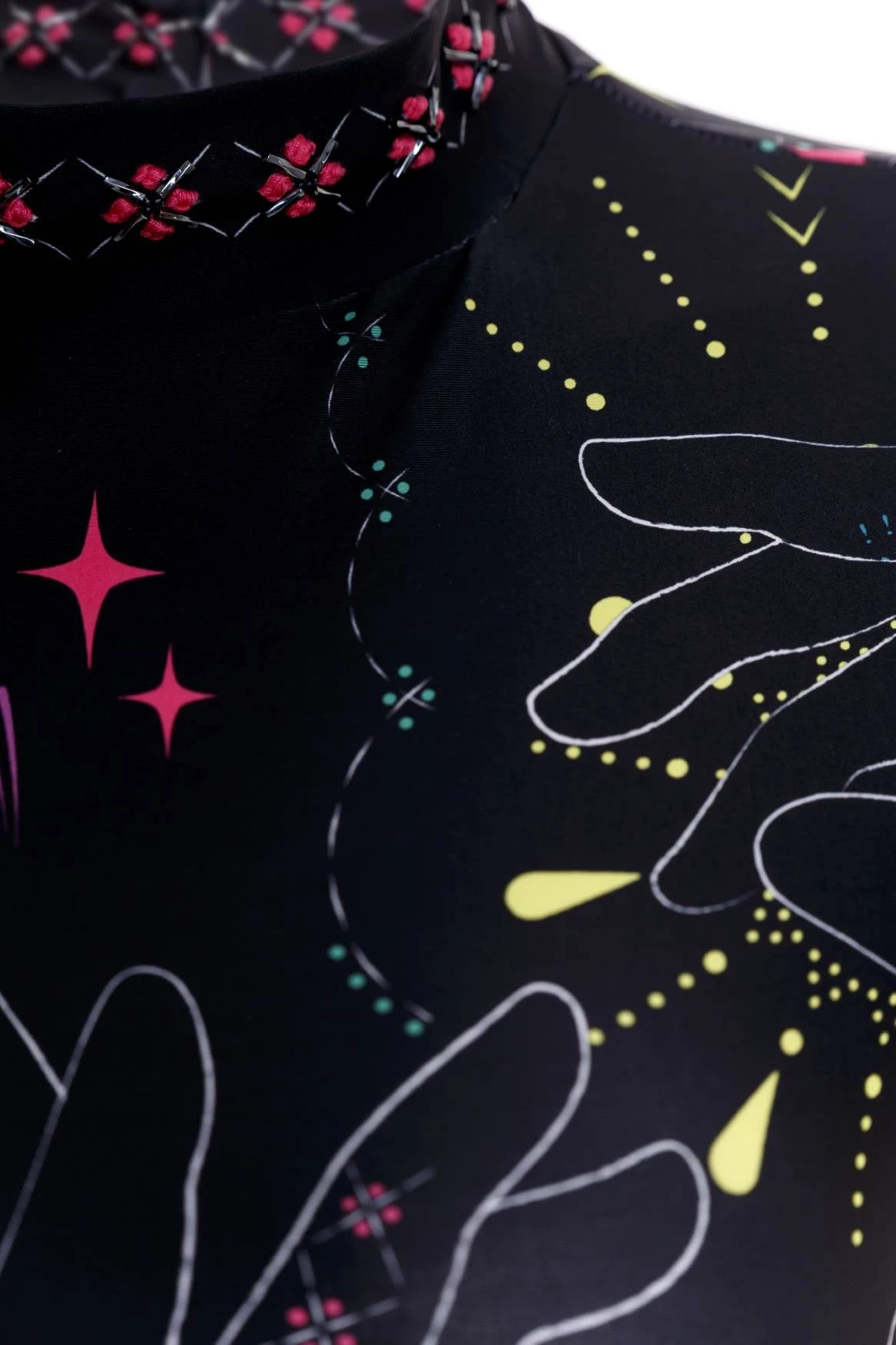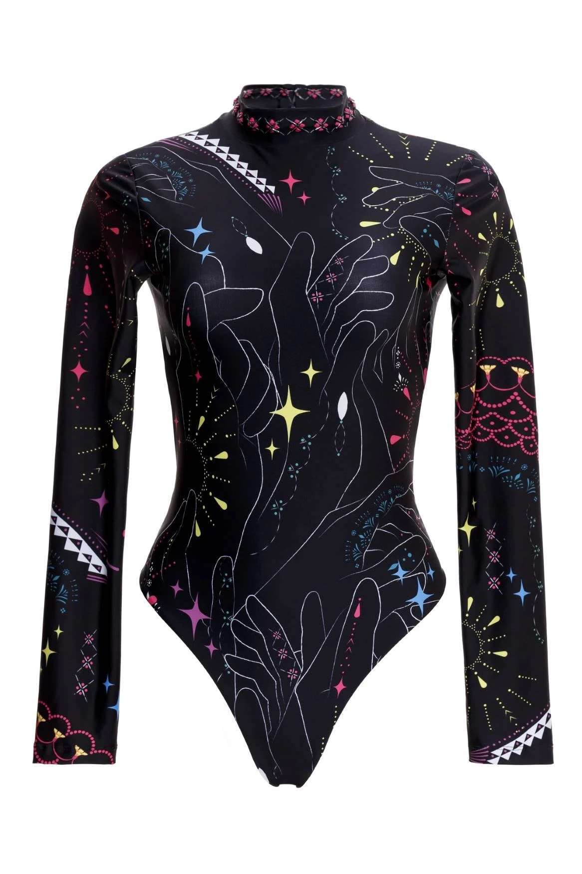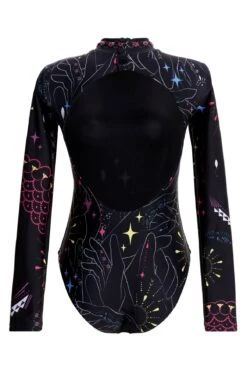 Our long-sleeve, open-backed bodysuit is decorated with artisan-drawn prints for a handcrafted look. It’s perfect for the beach or as a bodysuit worn with jeans and features a summary-back closure.