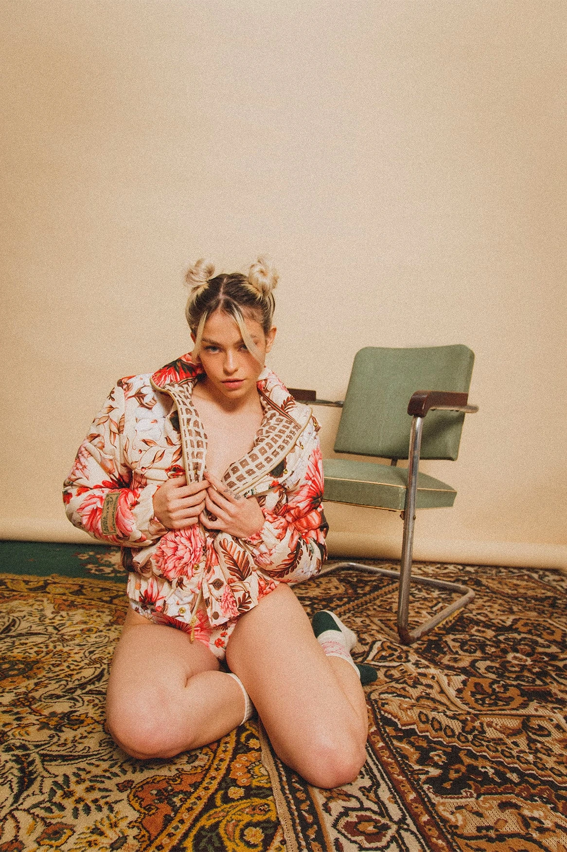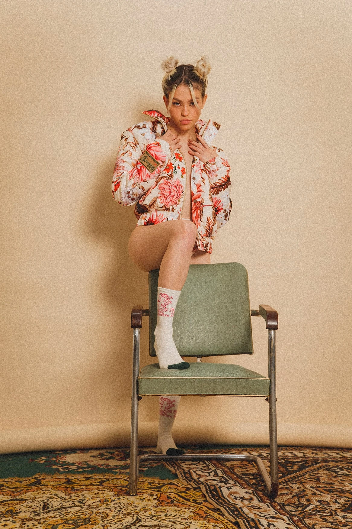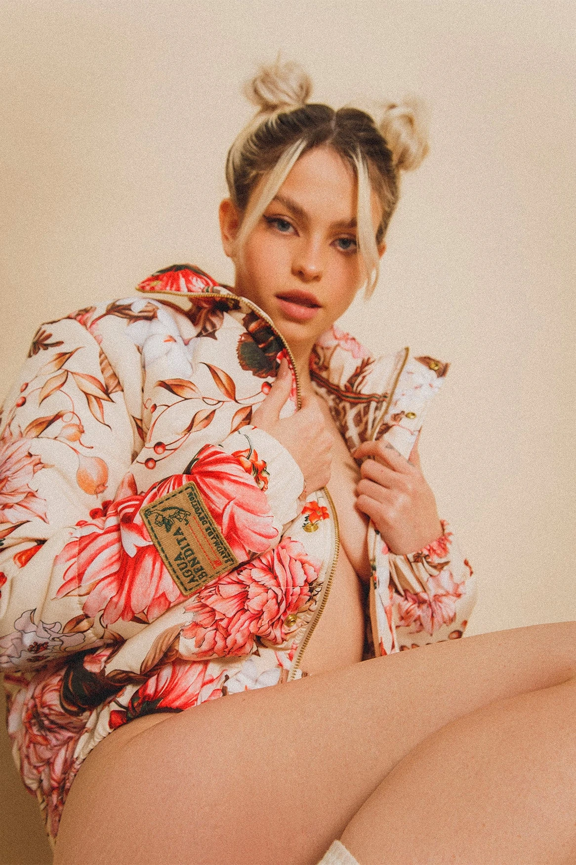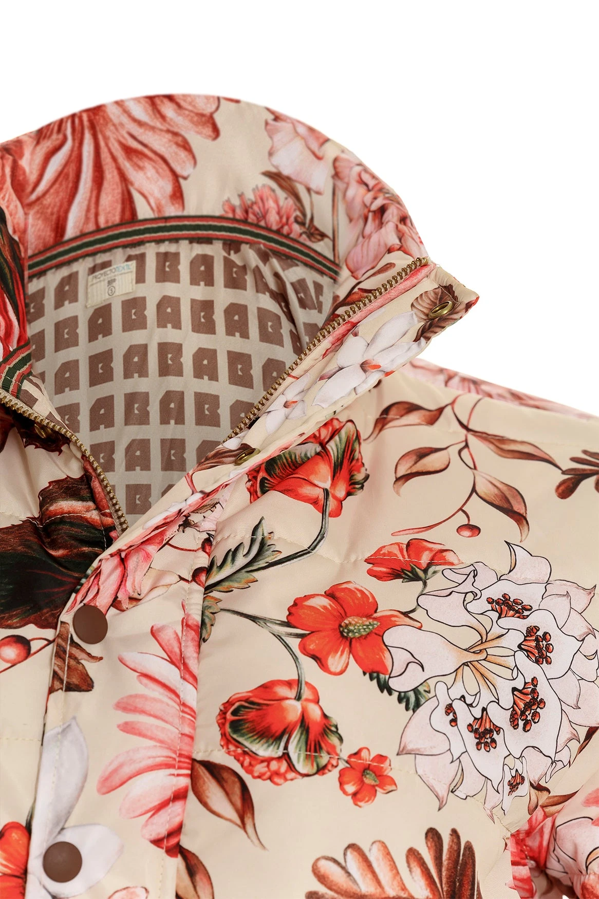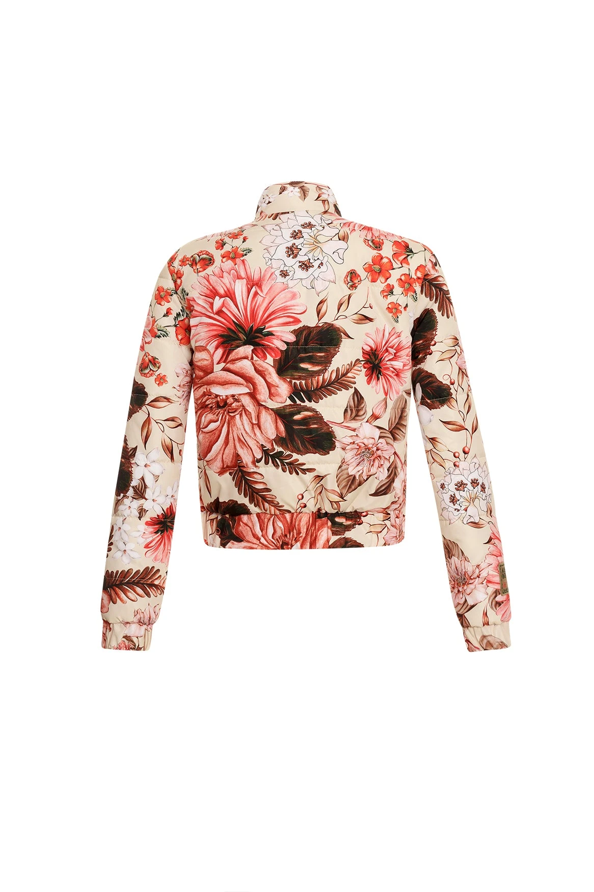 Semi-fitted floral puffer jacket with zipper front closure, topped with snap front closing and high collar. It features two side pockets and a brand patch on the right sleeve. It is the perfect piece to keep you warm and look stylish.