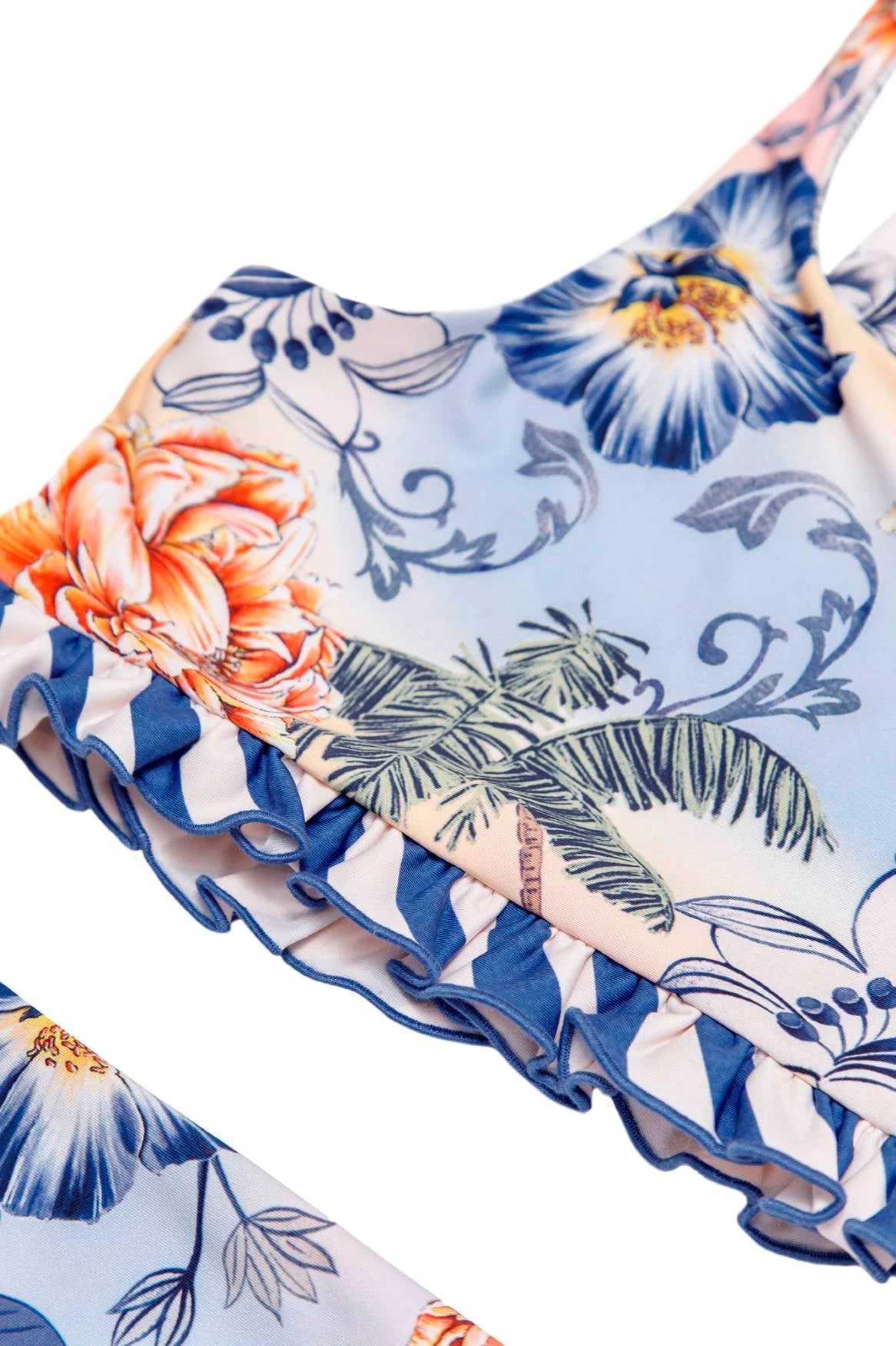 Our beautifully colored flower bikini swimsuit is trimmed with a ruffle, and high neck for adjustability and style. The Aleida Kids’ Bikini is reversible to a second print.