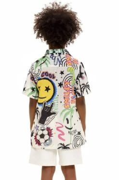 Button-front short-sleeve shirt decorated with oversized brightly colored motifs. Effortless and comfortable, this shirt is perfect for layering with other pieces for a fun day under the sun.