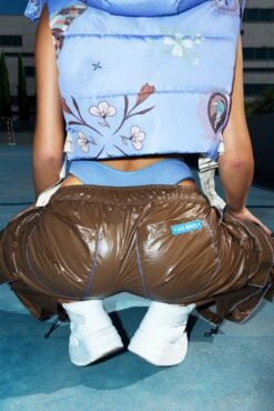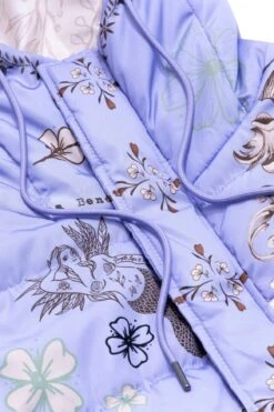 New silhouette! Our Korina puffer vest is cropped and has a hood with adjustable straps. Its print inspired by the land and its puffer-effect flowers make it an ideal piece to create a relaxed look but with a lot of style.