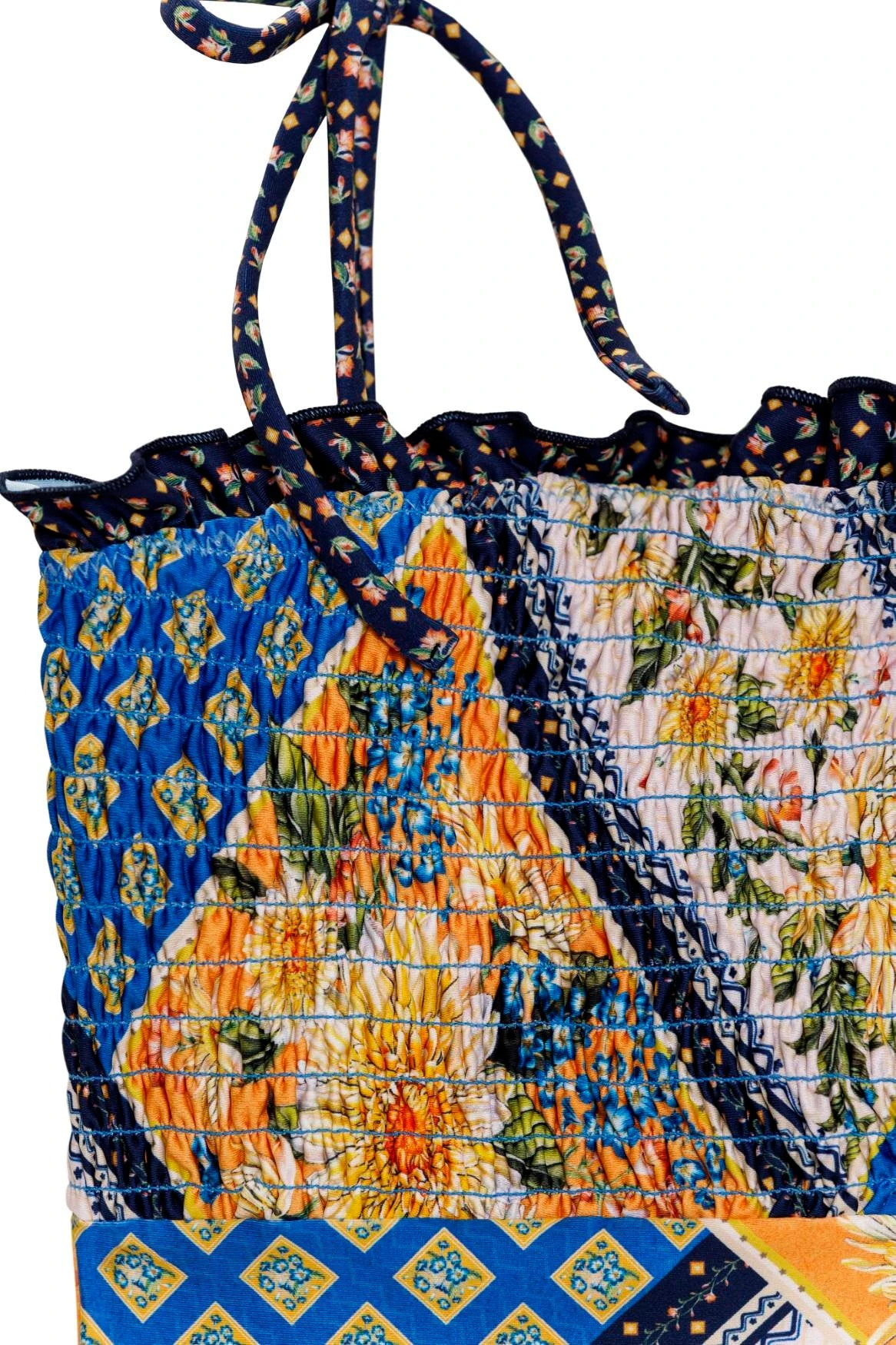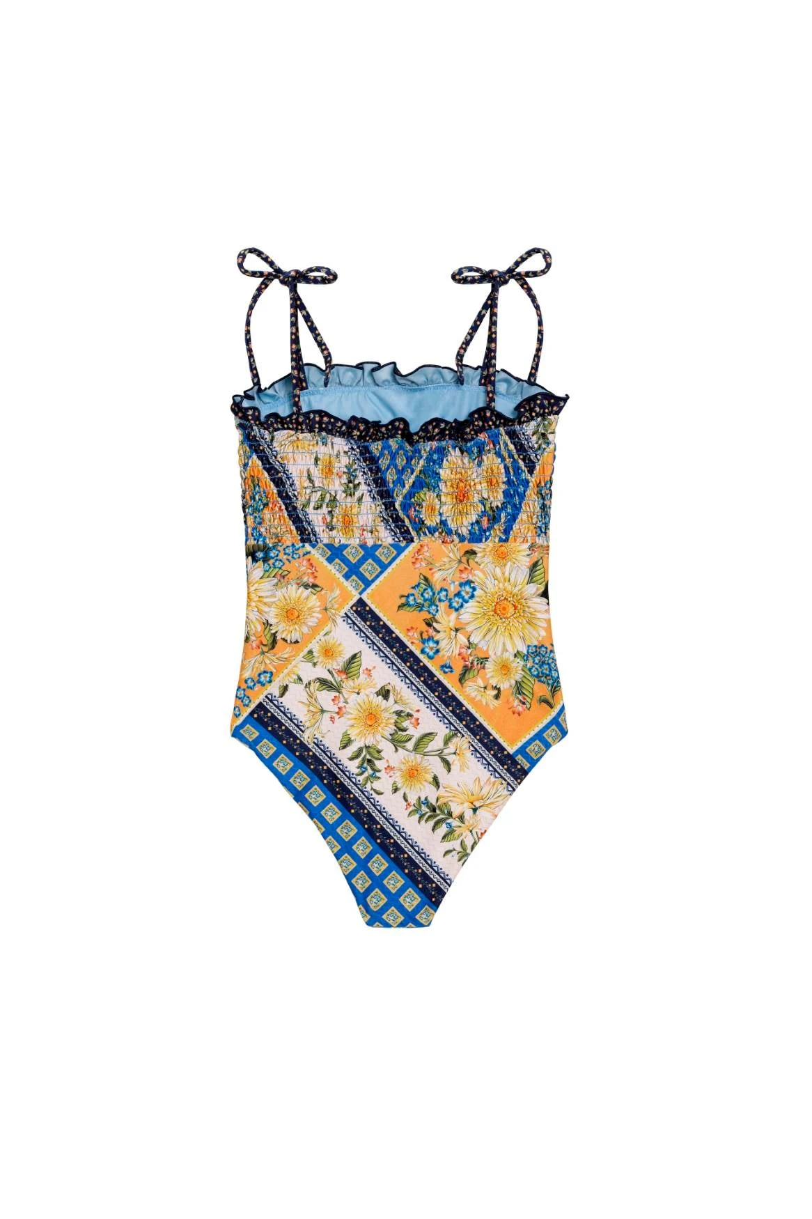 With a ruffle trim and a smocked top, this one-piece offers a unique tropical look with a flattering fit.