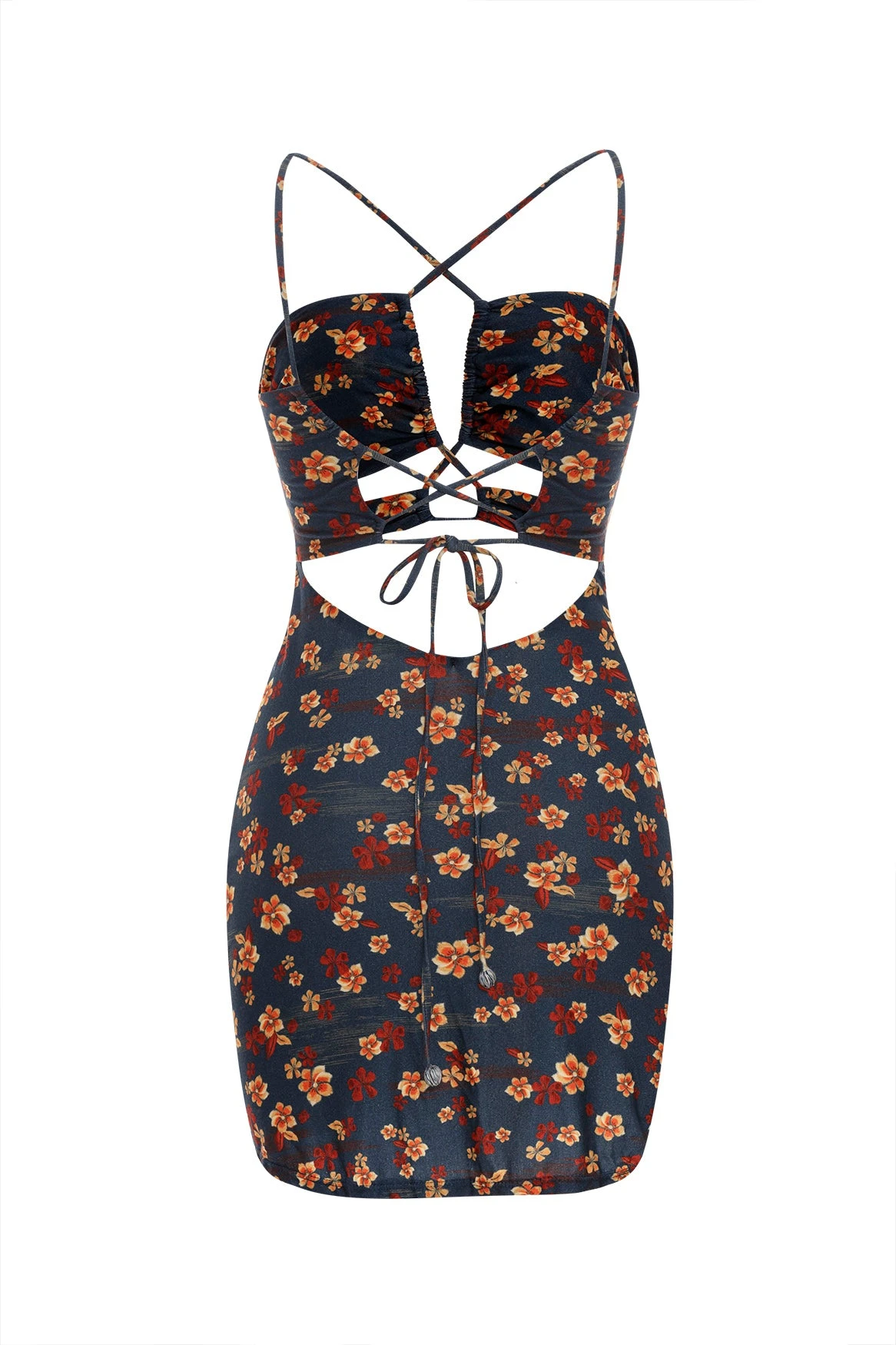 Our effortlessly chic cut-out mini dress features strappy ties in the back for adjustability and ruching in the front skirt for a flattering look. Perfect for any occasion.