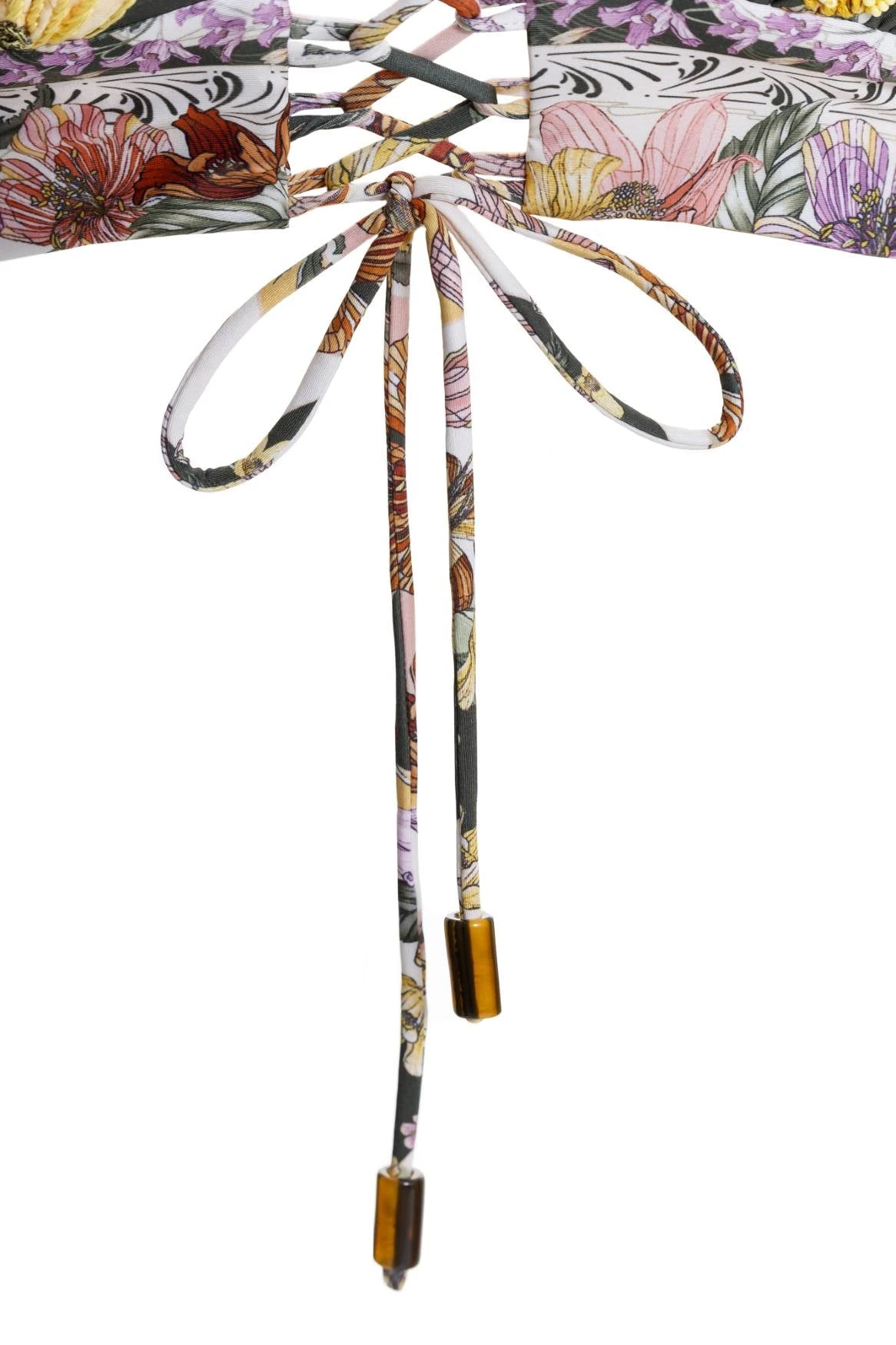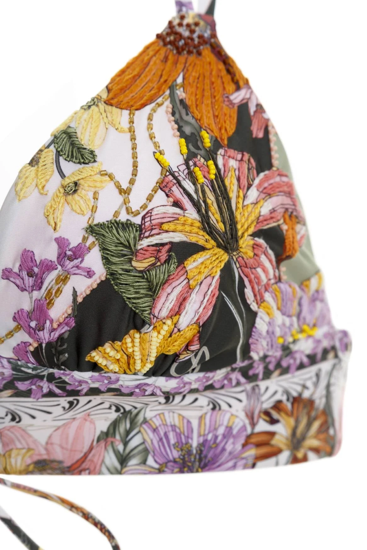 The Mia Bikini Top is a timeless bralette with the perfect fit. Lace-up front for adjustability and adjustable back straps. Trimmed with handmade embroidery and beading by artisans. Tie ends are finished with hand-beaded fruits. This piece was embroidered for 20 hours, creating an exclusive piece full of art.